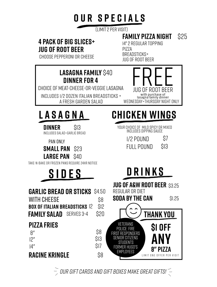 - With a commitment to quality and community, Hugo’s is not just another pizza stop—it’s a beloved local treasure.